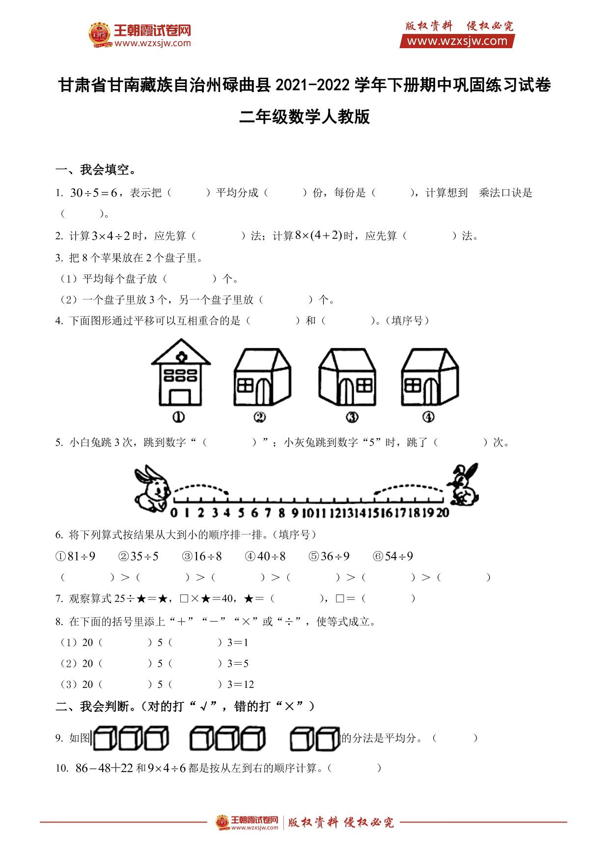 甘肃省甘南藏族自治州碌曲县2021-2022学年下册期中巩固练习试卷二年级数学(人教版)