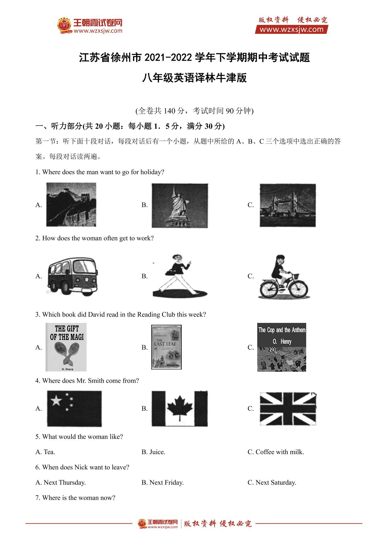 江苏省徐州市2021-2022学年下学期期中考试试题八年级英语(译林牛津版)【无听力音频】