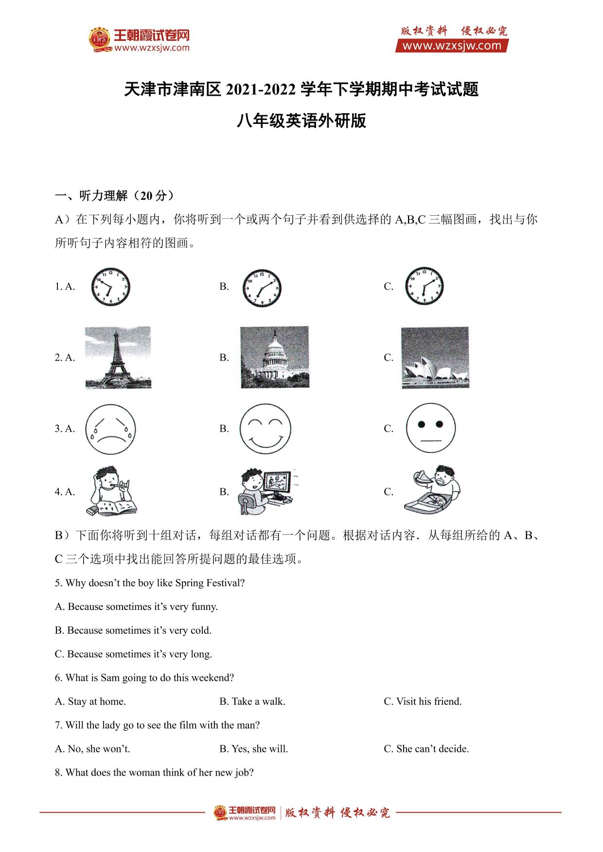 天津市津南区2021-2022学年下学期期中考试试题八年级英语(外研版)【无听力音频】