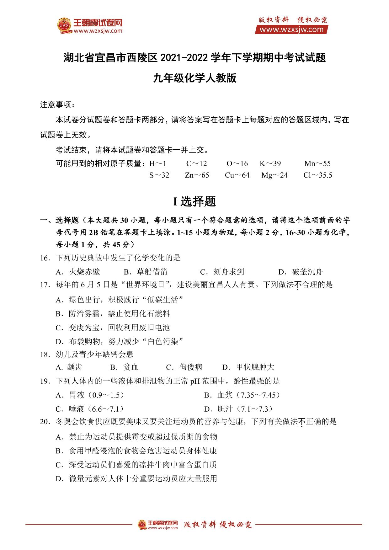 湖北省宜昌市西陵区2021-2022学年下学期期中考试试题九年级化学(人教版)