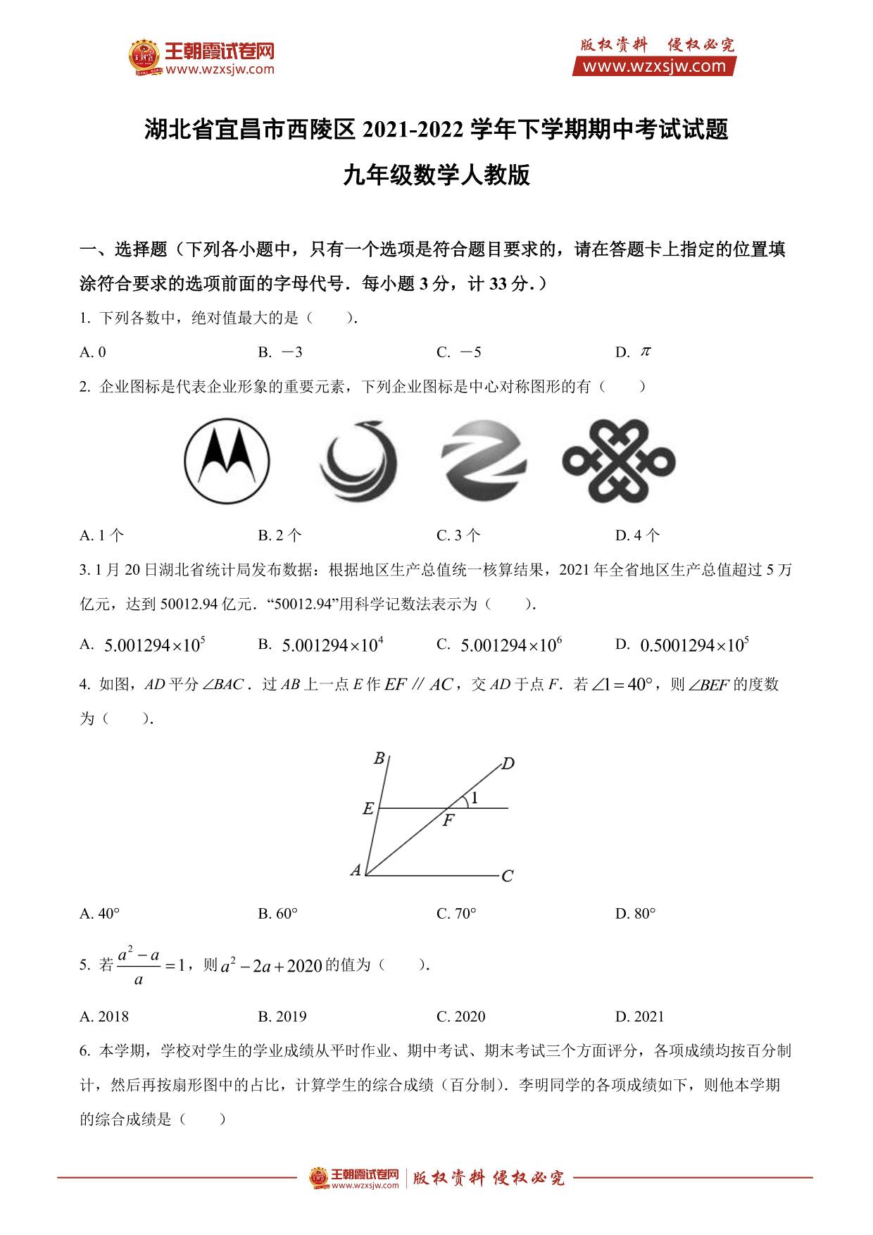 湖北省宜昌市西陵区2021-2022学年下学期期中考试试题九年级数学(人教版)