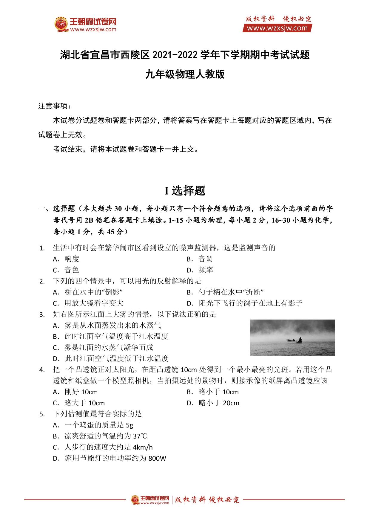 湖北省宜昌市西陵区2021-2022学年下学期期中考试试题九年级物理(人教版)