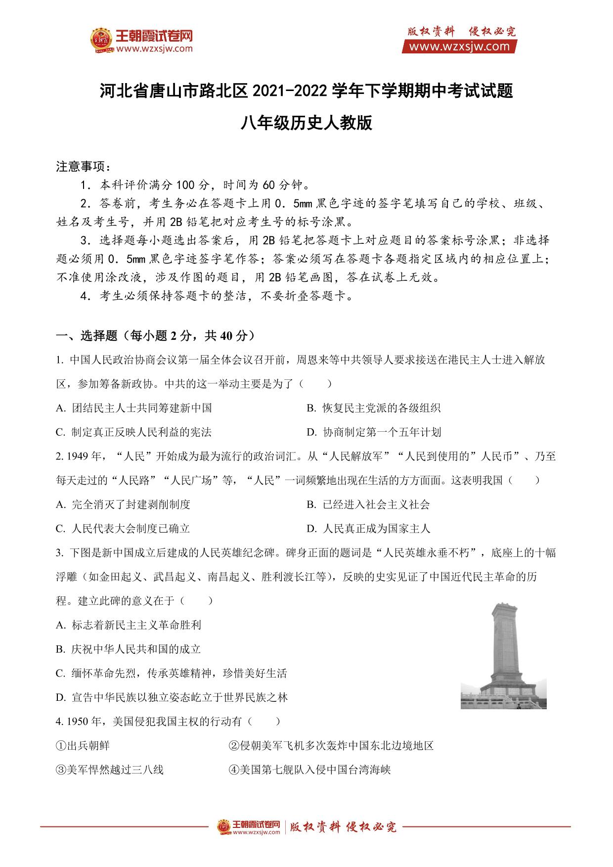 河北省唐山市路北区2021-2022学年下学期期中考试试题八年级历史(人教版)
