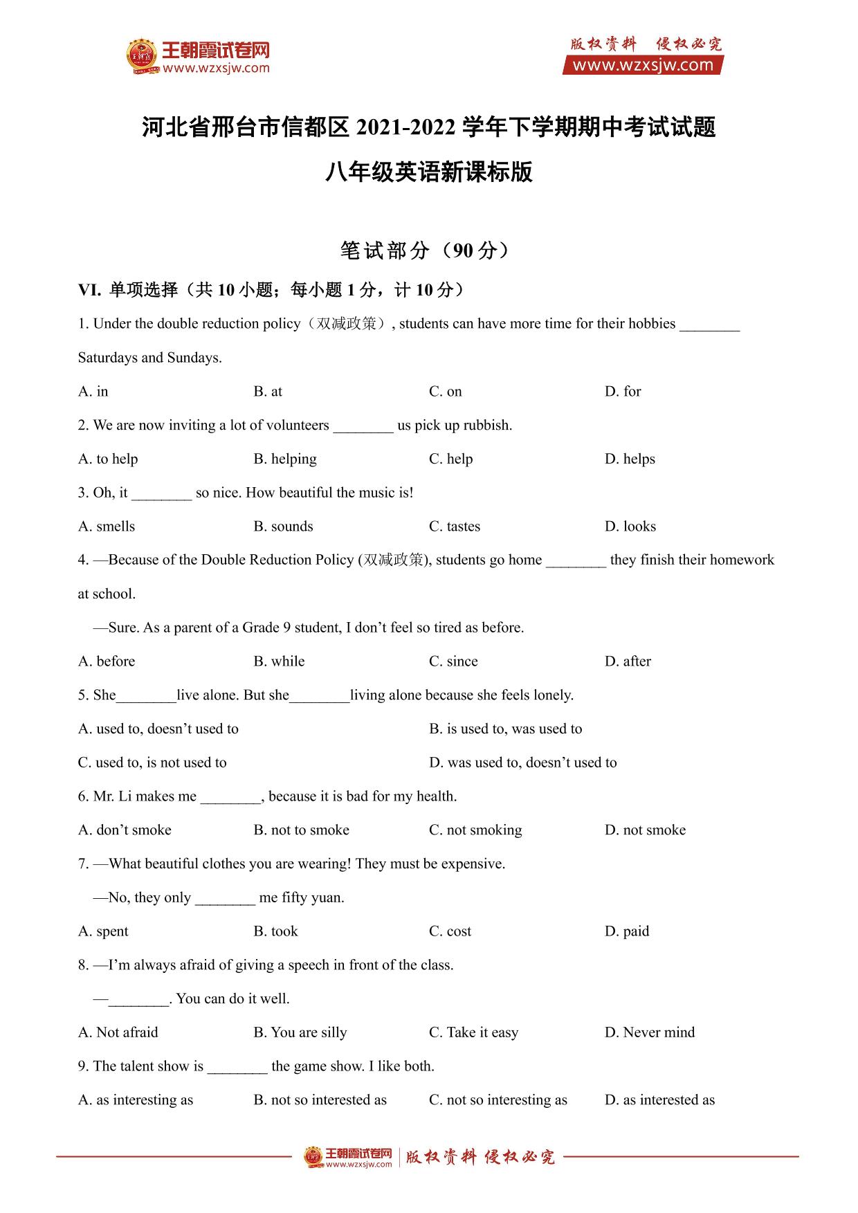 河北省邢台市信都区2021-2022学年下学期期中考试试题八年级英语(新课标版)【无听力音频】