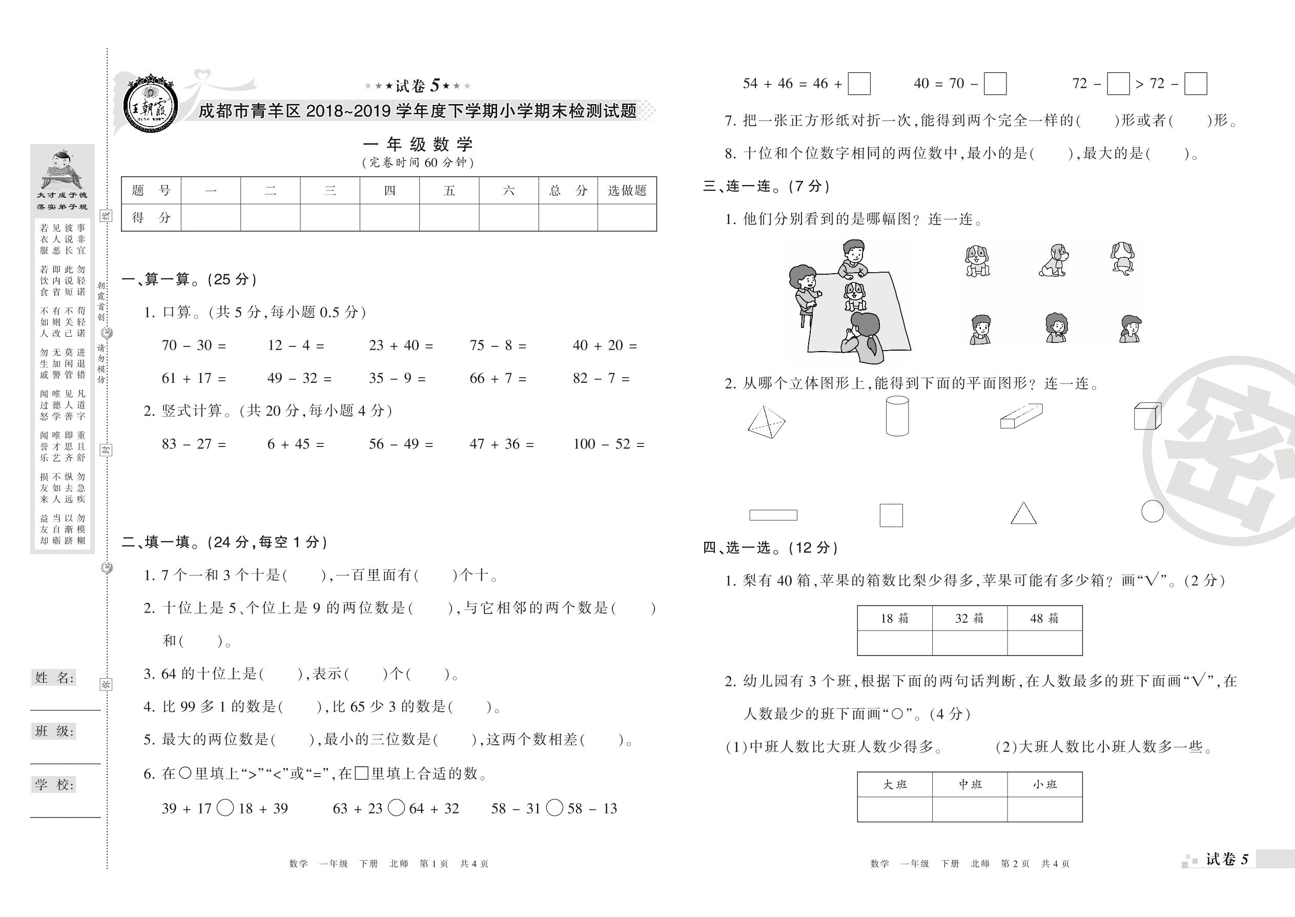 2018-2019学年第二学期成都市青羊区一年级数学试卷(北师版)【5】