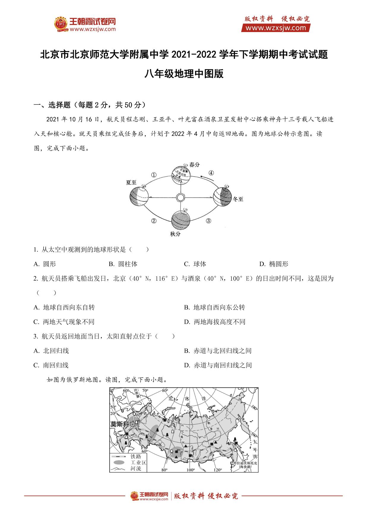 北京市北京师范大学附属中学2021-2022学年下学期期中考试试题八年级地理(中图版)