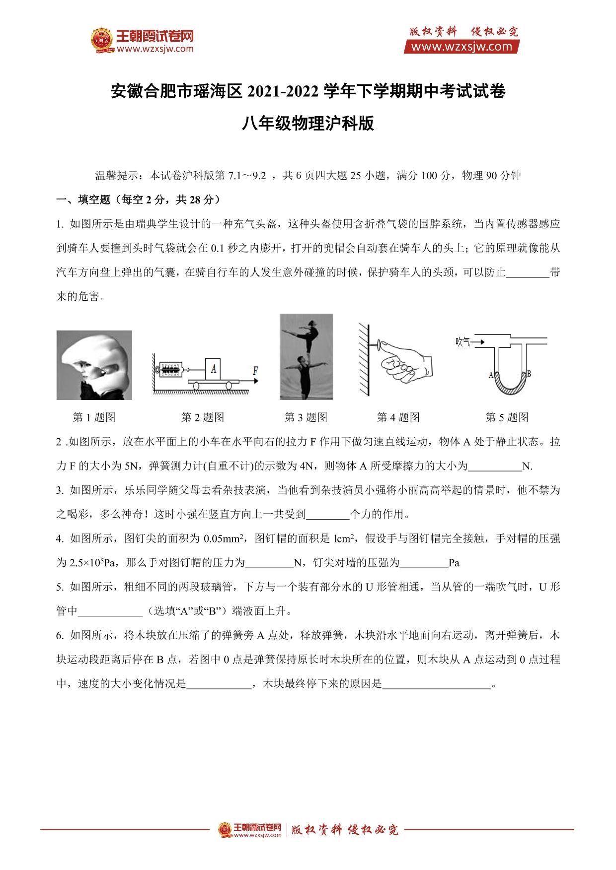 安徽合肥市瑶海区2021-2022学年下学期期中考试试卷八年级物理(沪科版)
