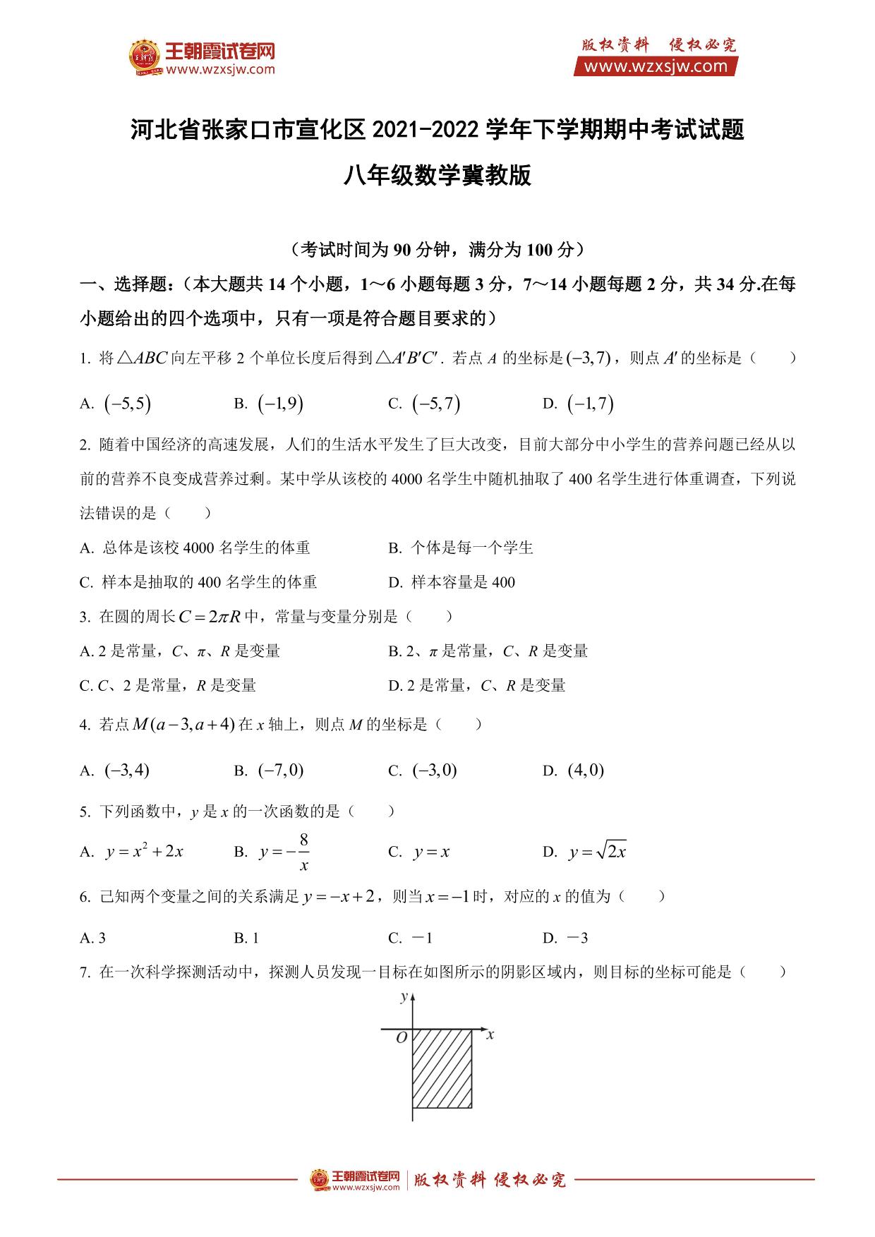 河北省张家口市宣化区2021-2022学年下学期期中考试试题八年级数学(冀教版)