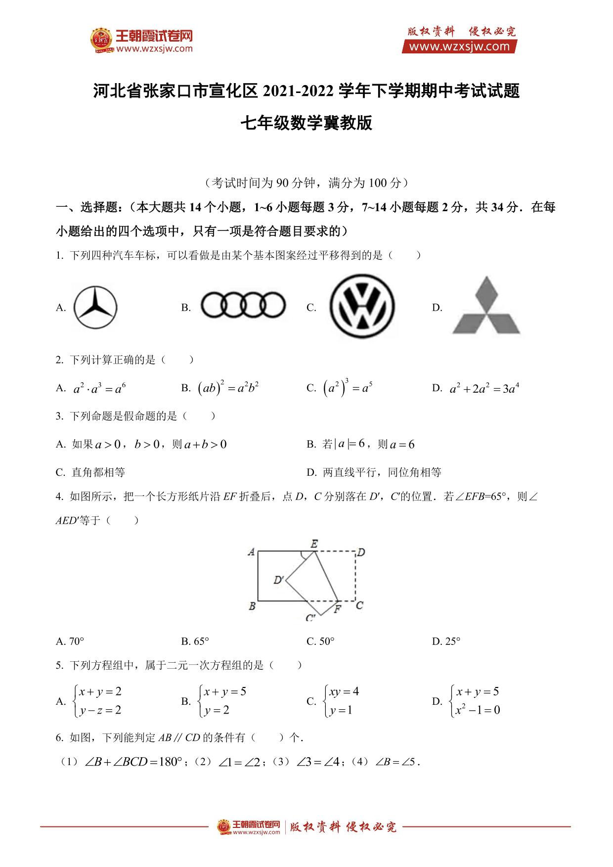 河北省张家口市宣化区2021-2022学年下学期期中考试试题七年级数学(冀教版)