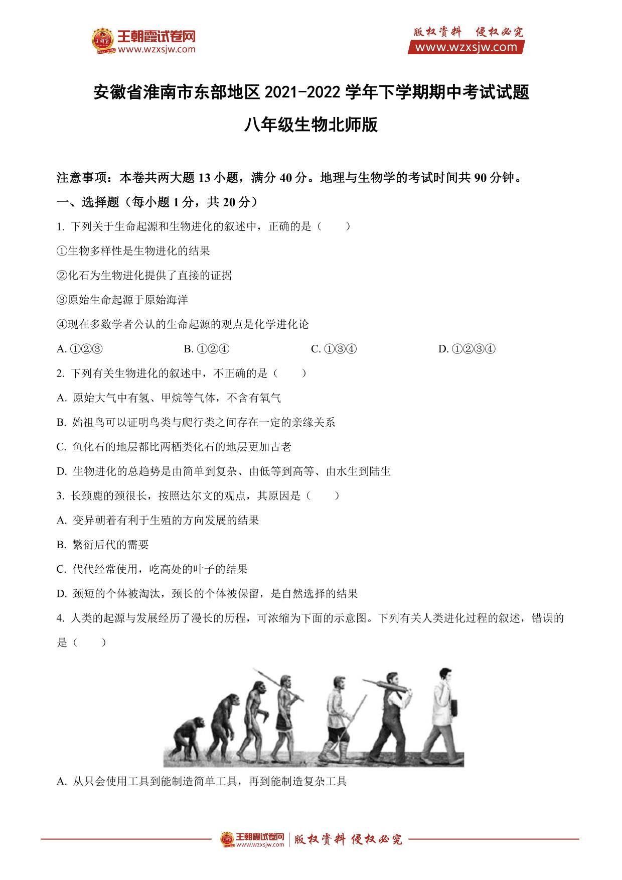 安徽省淮南市东部地区2021-2022学年下学期期中考试试题八年级生物(北师版)