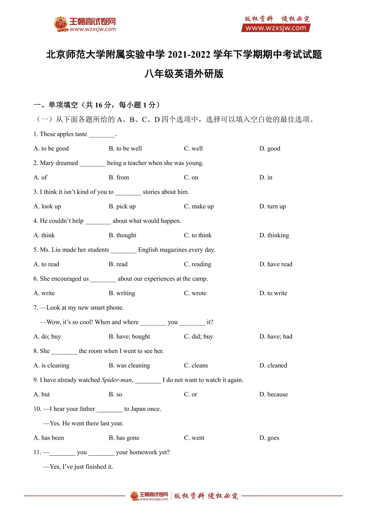 北京市北京师范大学附属实验中学2021-2022学年下学期期中考试试题八年级英语(外研版)【无听力音频】