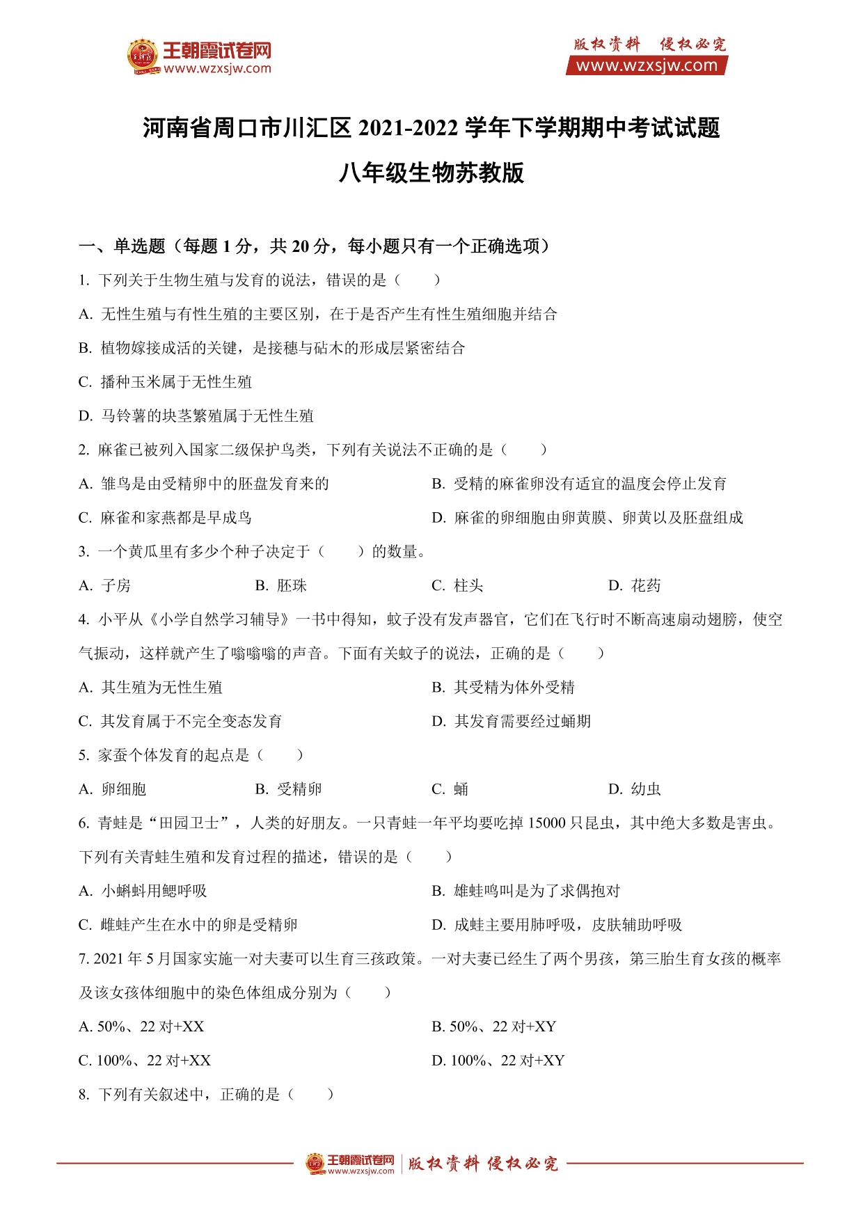 河南省周口市川汇区2021-2022学年下学期期中考试试题八年级生物(苏教版)