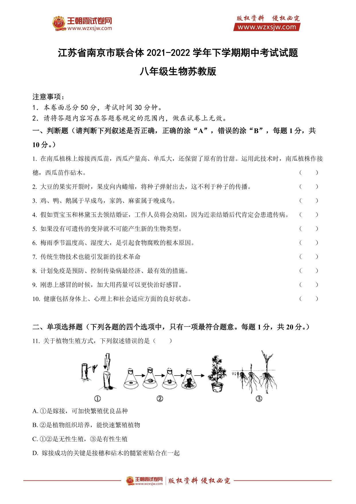 江苏省南京市联合体2021-2022学年下学期期中考试试题八年级生物(苏教版)