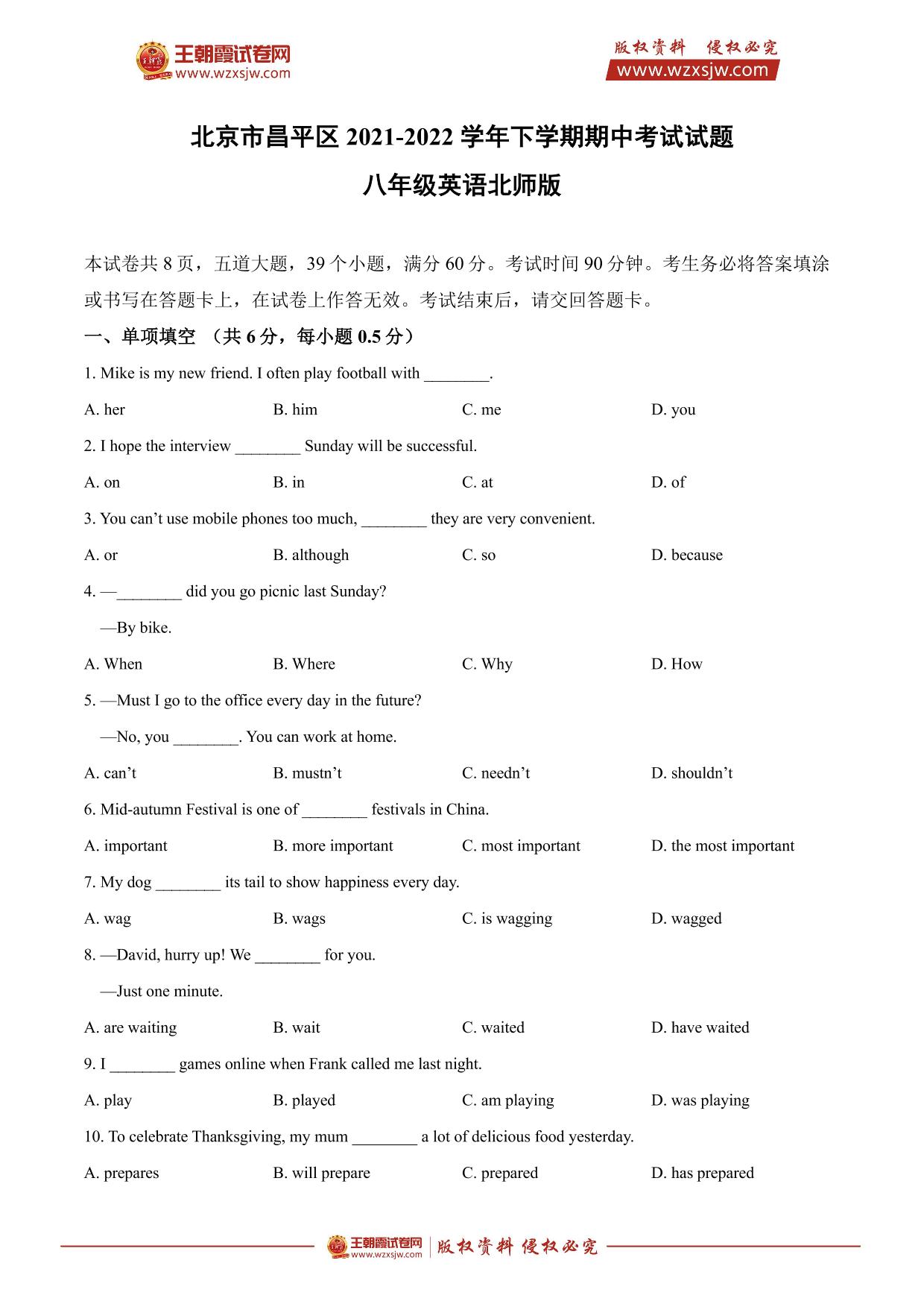 北京市昌平区2021-2022学年下学期期中考试试题八年级英语(北师版)【无听力音频】