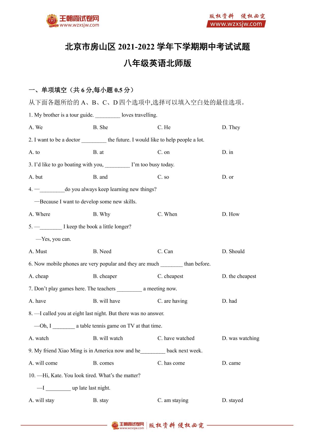 北京市房山区2021-2022学年下学期期中考试试题八年级英语(北师版)【无听力音频】