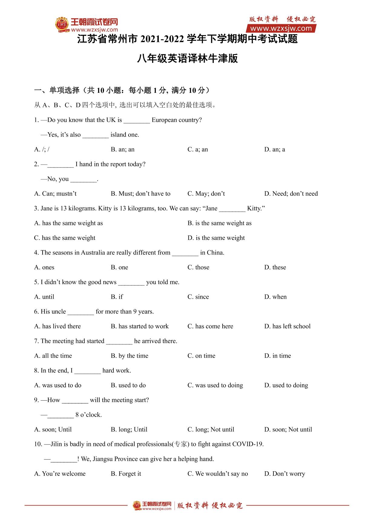 江苏省常州市2021-2022学年下学期期中考试试题八年级英语(译林牛津版)【无听力音频】