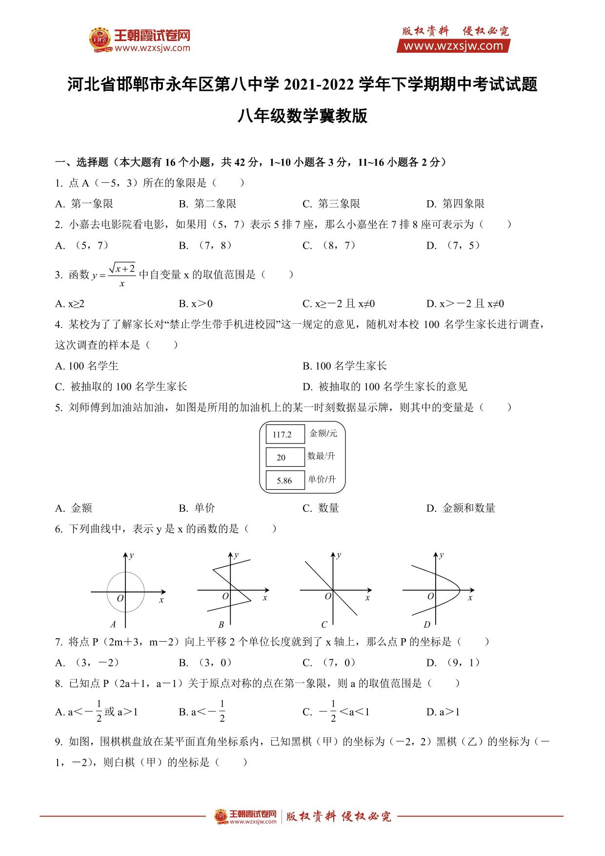 河北省邯郸市永年区第八中学2021-2022学年下学期期中考试试题八年级数学(冀教版)