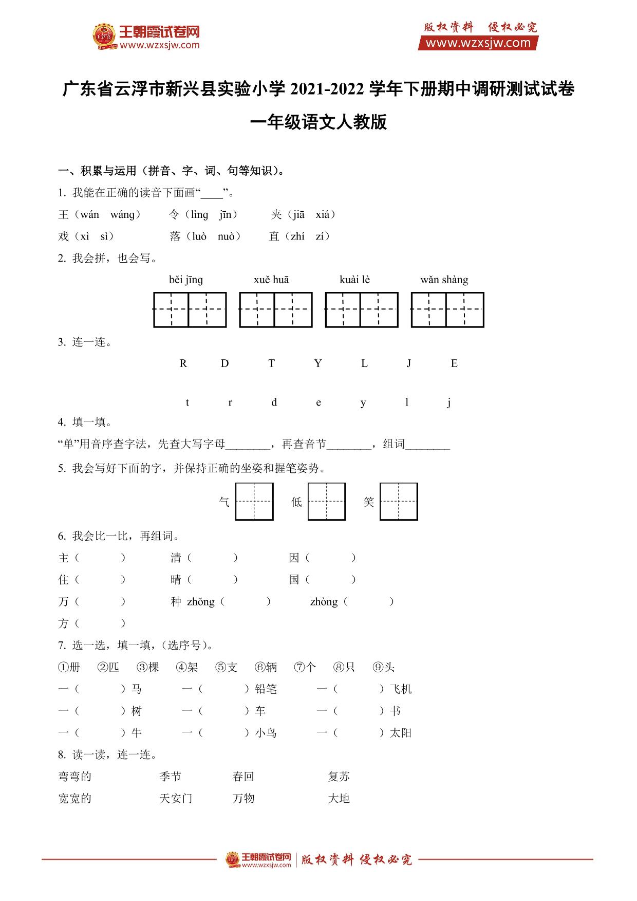 广东省云浮市新兴县实验小学2021-2022学年下册期中调研测试试卷一年级语文(人教版)