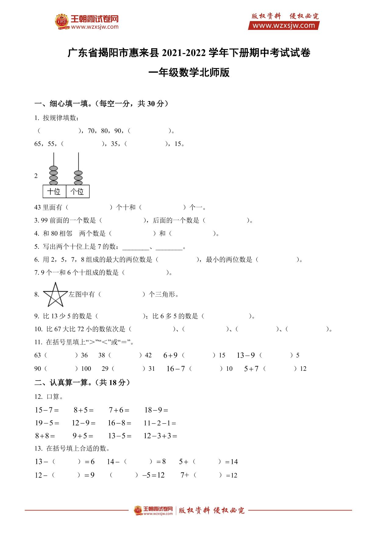 广东省揭阳市惠来县2021-2022学年下册期中考试试卷一年级数学(北师版)