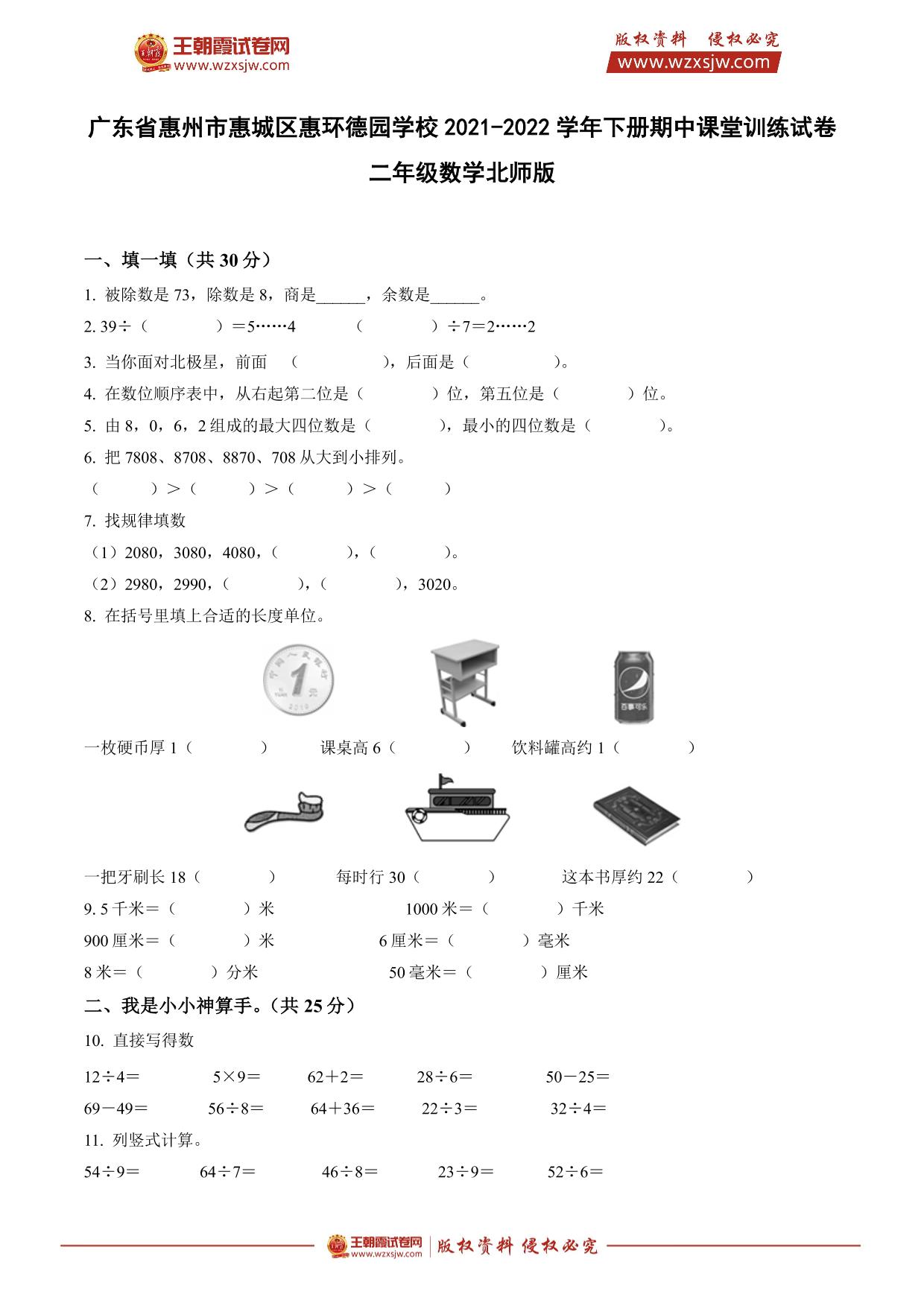 广东省惠州市惠城区惠环德园学校2021-2022学年下册期中课堂训练试卷二年级数学(北师版)