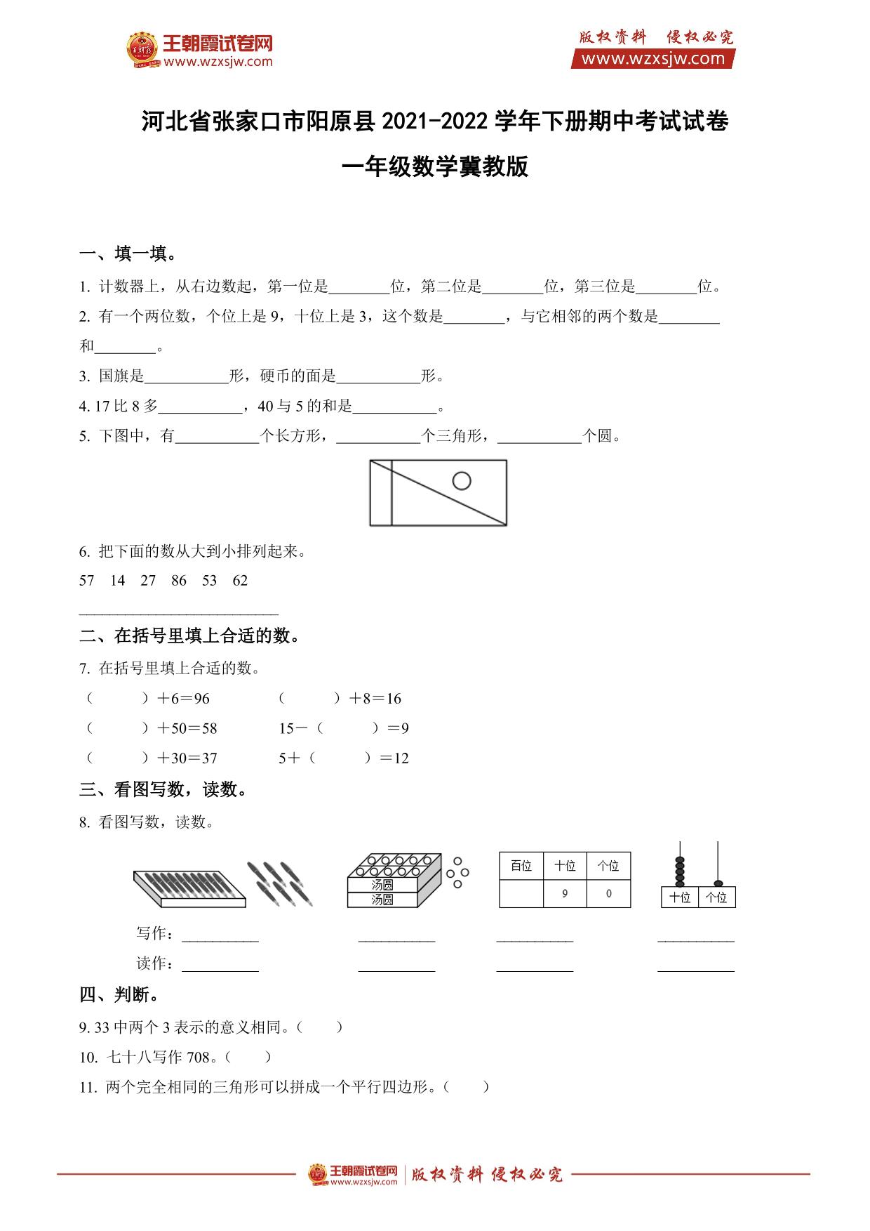 河北省张家口市阳原县2021-2022学年下册期中考试试卷一年级数学(冀教版)