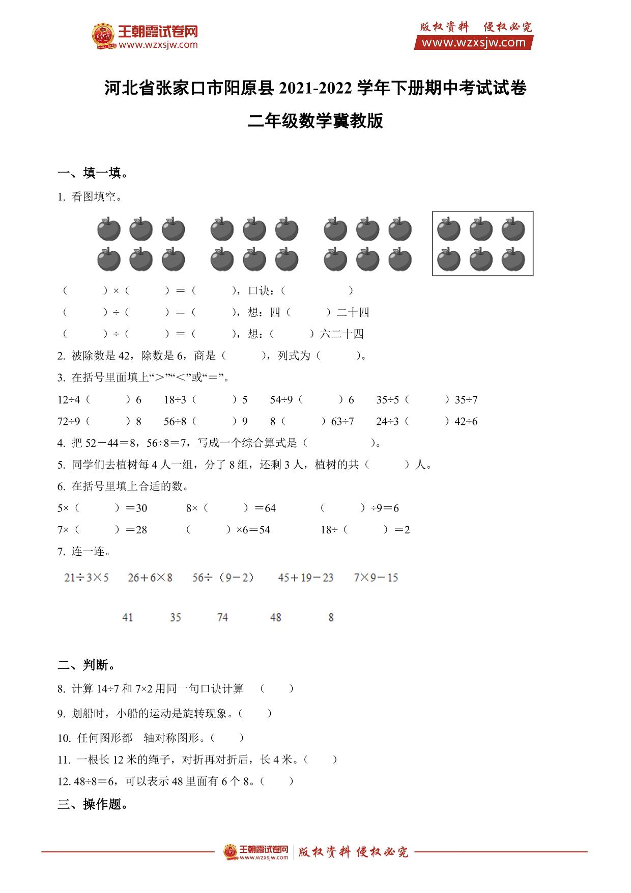 河北省张家口市阳原县2021-2022学年下册期中考试试卷二年级数学(冀教版)