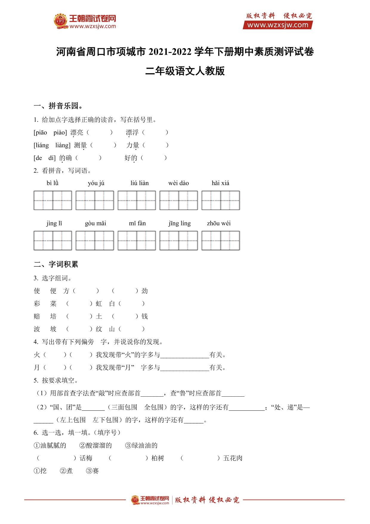 河南省周口市项城市2021-2022学年下册期中素质测评试卷二年级语文(人教版)