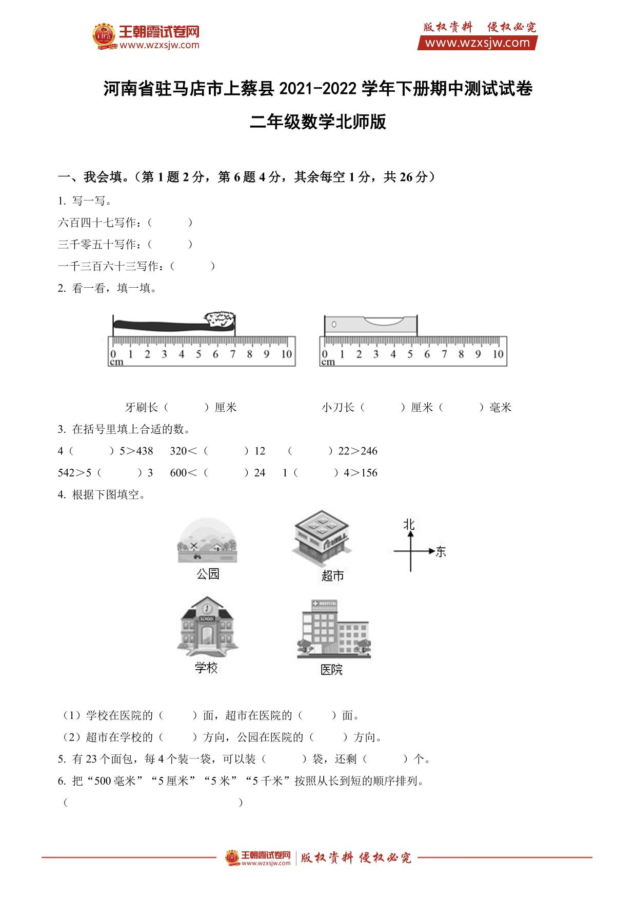 河南省驻马店市上蔡县2021-2022学年下册期中测试试卷二年级数学(北师版)