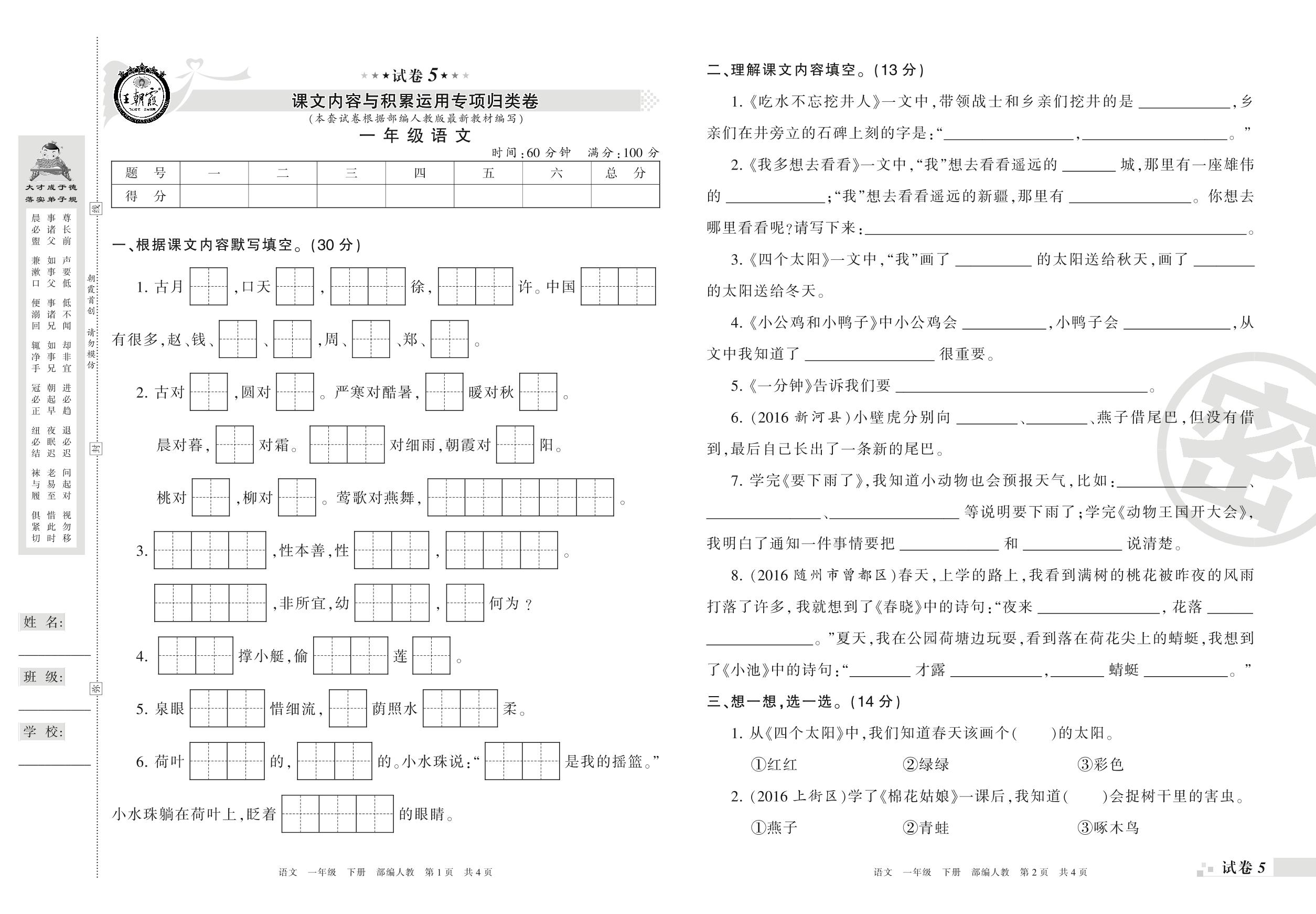 王朝霞期末专项卷——课文内容与积累运用专项归类卷一年级下册语文(人教版)_R210731190439【5】