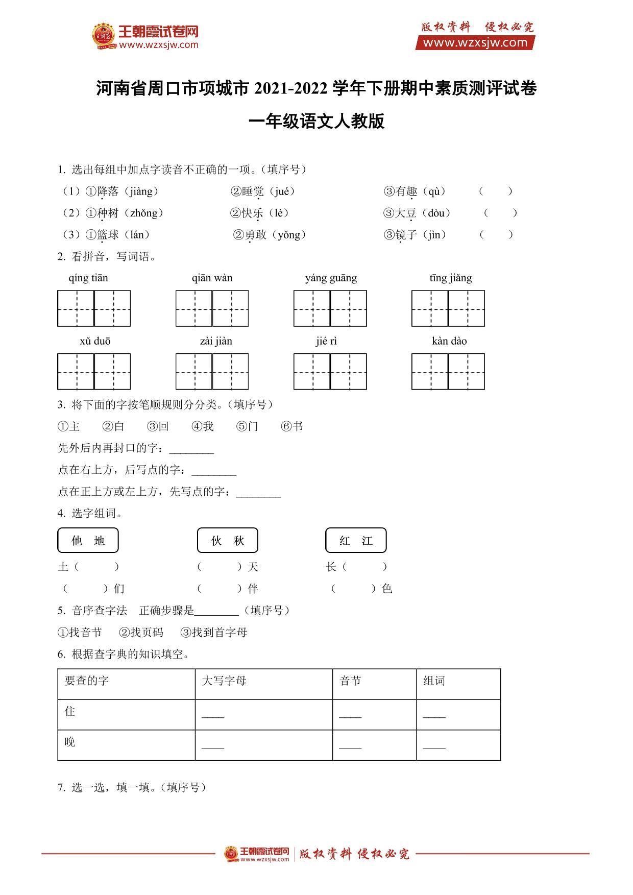 河南省周口市项城市2021-2022学年下册期中素质测评试卷一年级语文(人教版)
