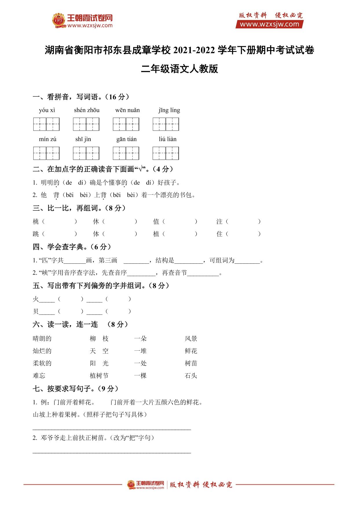 湖南省衡阳市祁东县成章学校2021-2022学年下册期中考试试卷二年级语文(人教版)