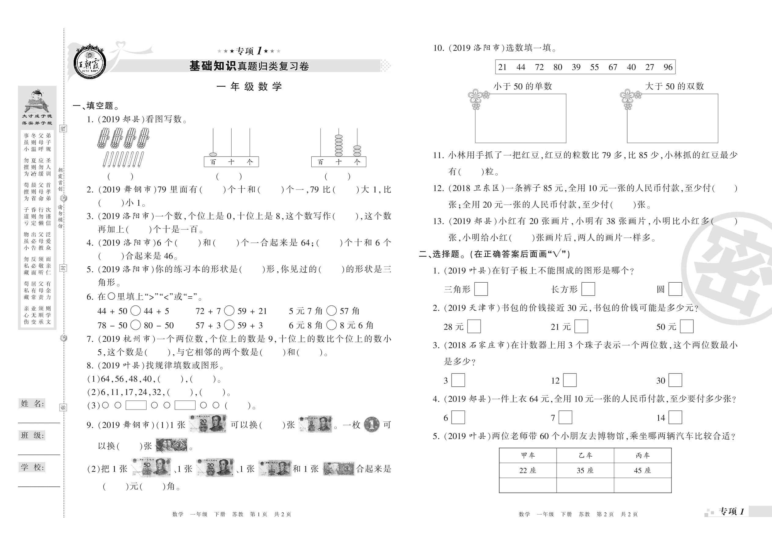 王朝霞期末专项卷——基础知识、计算真题归类复习卷一年级下册数学(苏教版)_R210802213546【0】
