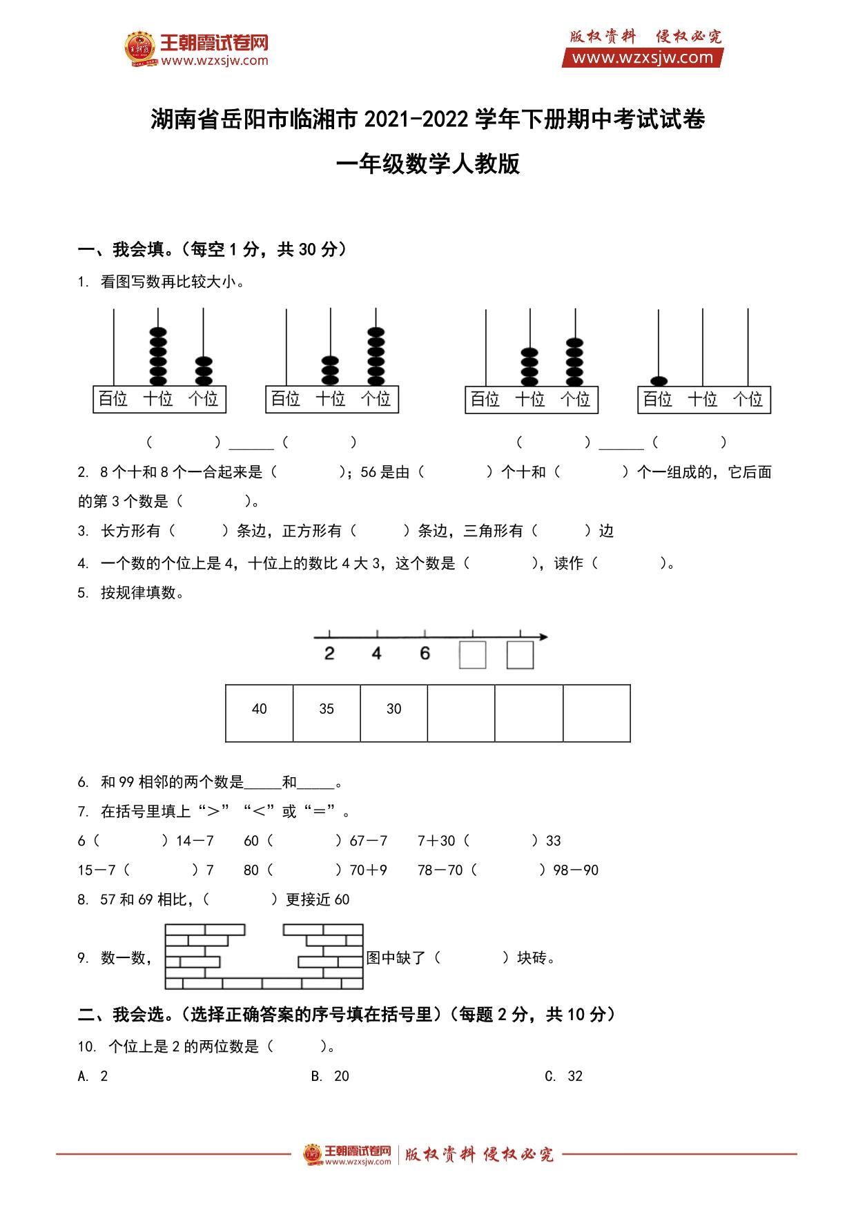 湖南省岳阳市临湘市2021-2022学年下册期中考试试卷一年级数学(人教版)