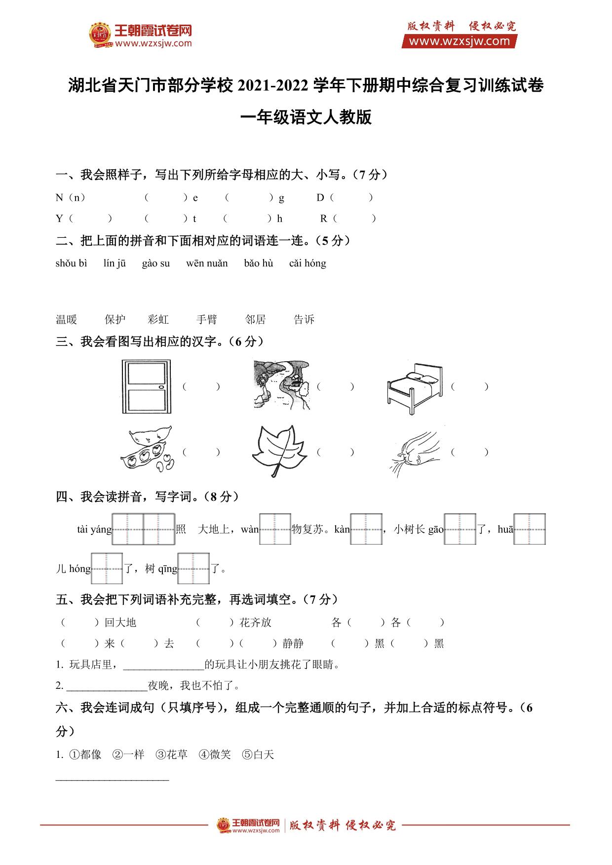 湖北省天门市部分学校2021-2022学年下册期中综合复习训练试卷一年级语文(人教版)