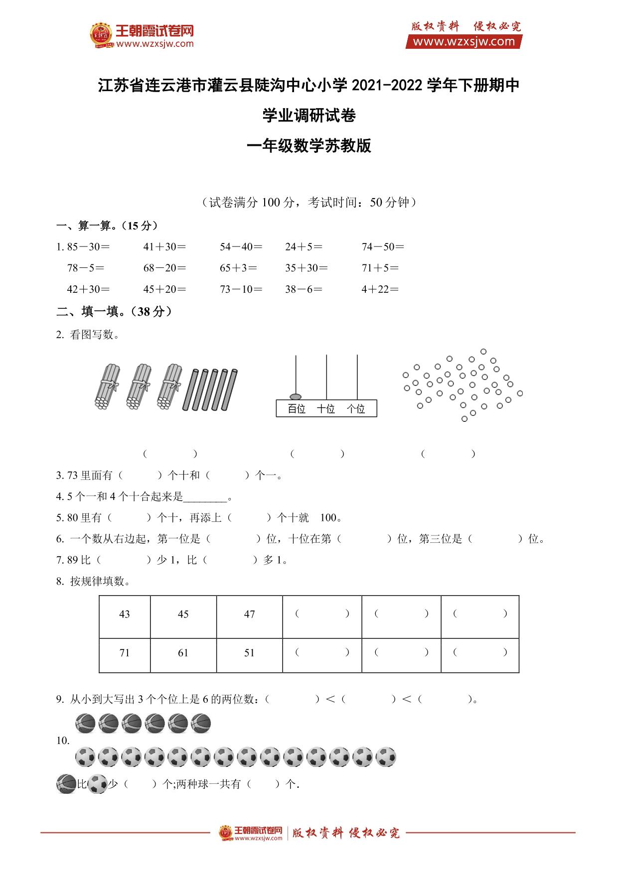 江苏省连云港市灌云县陡沟中心小学2021-2022学年下册期中学业调研试卷一年级数学(苏教版)