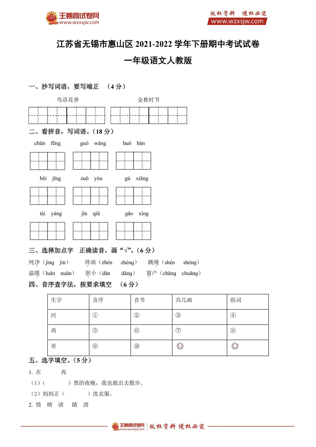 江苏省无锡市惠山区2021-2022学年下册期中考试试卷一年级语文(人教版)