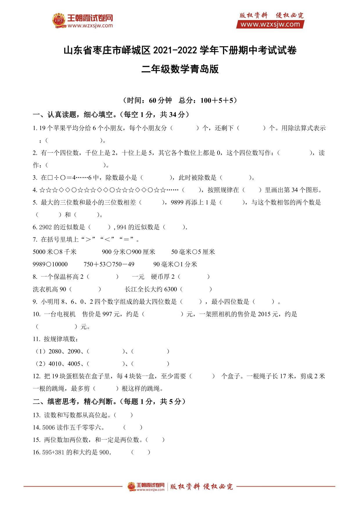 山东省枣庄市峄城区2021-2022学年下册期中考试试卷二年级数学(青岛版)