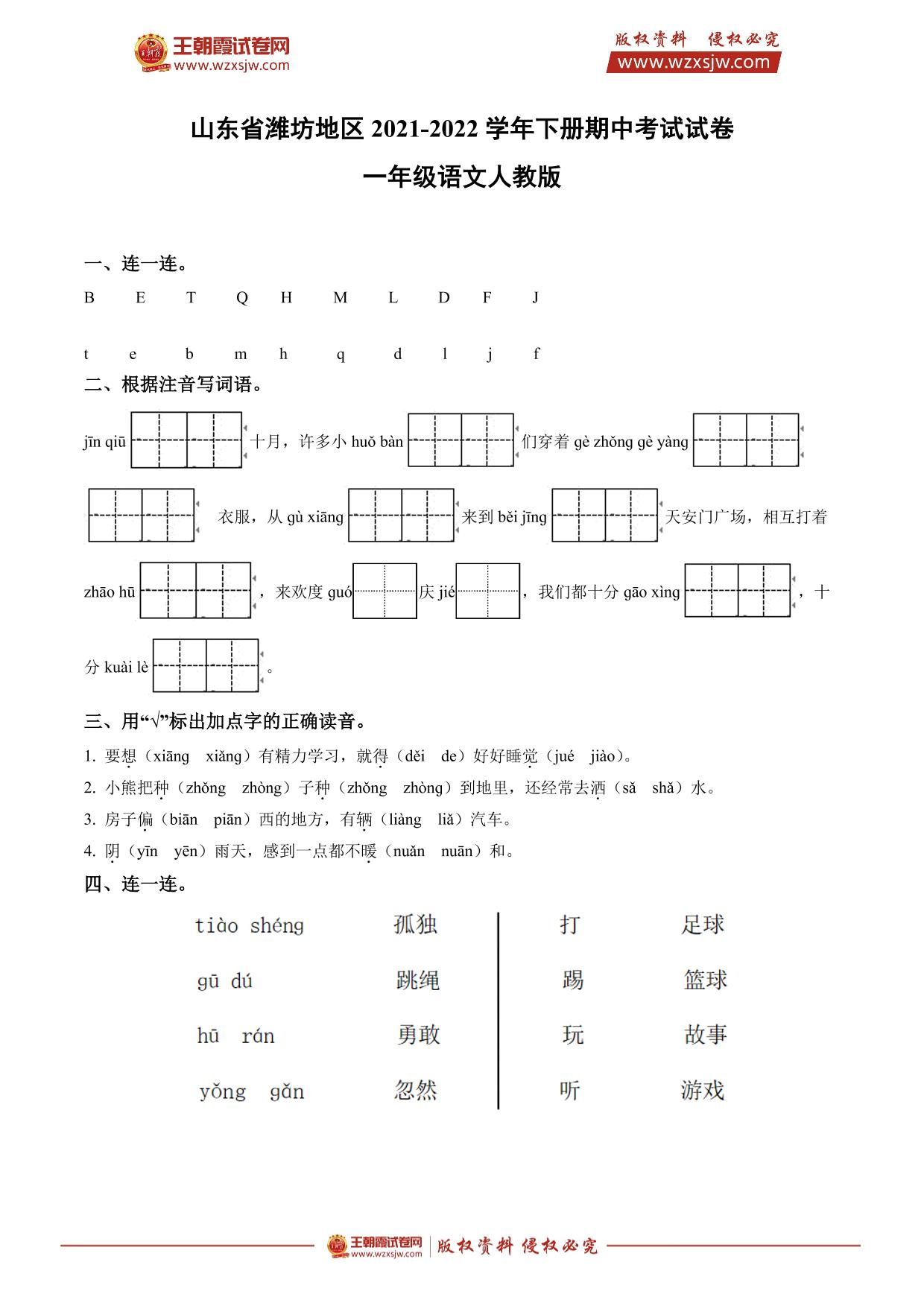 山东省潍坊地区2021-2022学年下册期中考试试卷一年级语文(人教版)