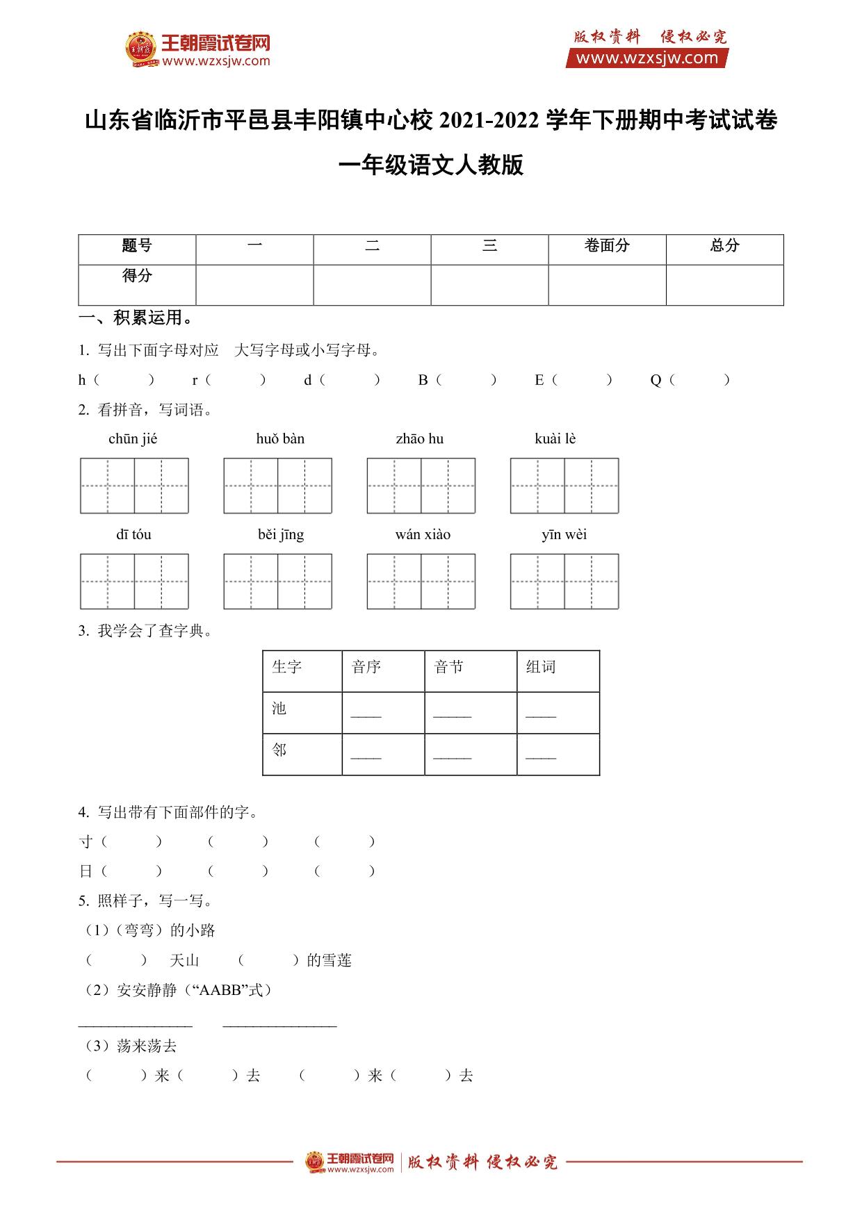 山东省临沂市平邑县丰阳镇中心校2021-2022学年下册期中考试试卷一年级语文(人教版)