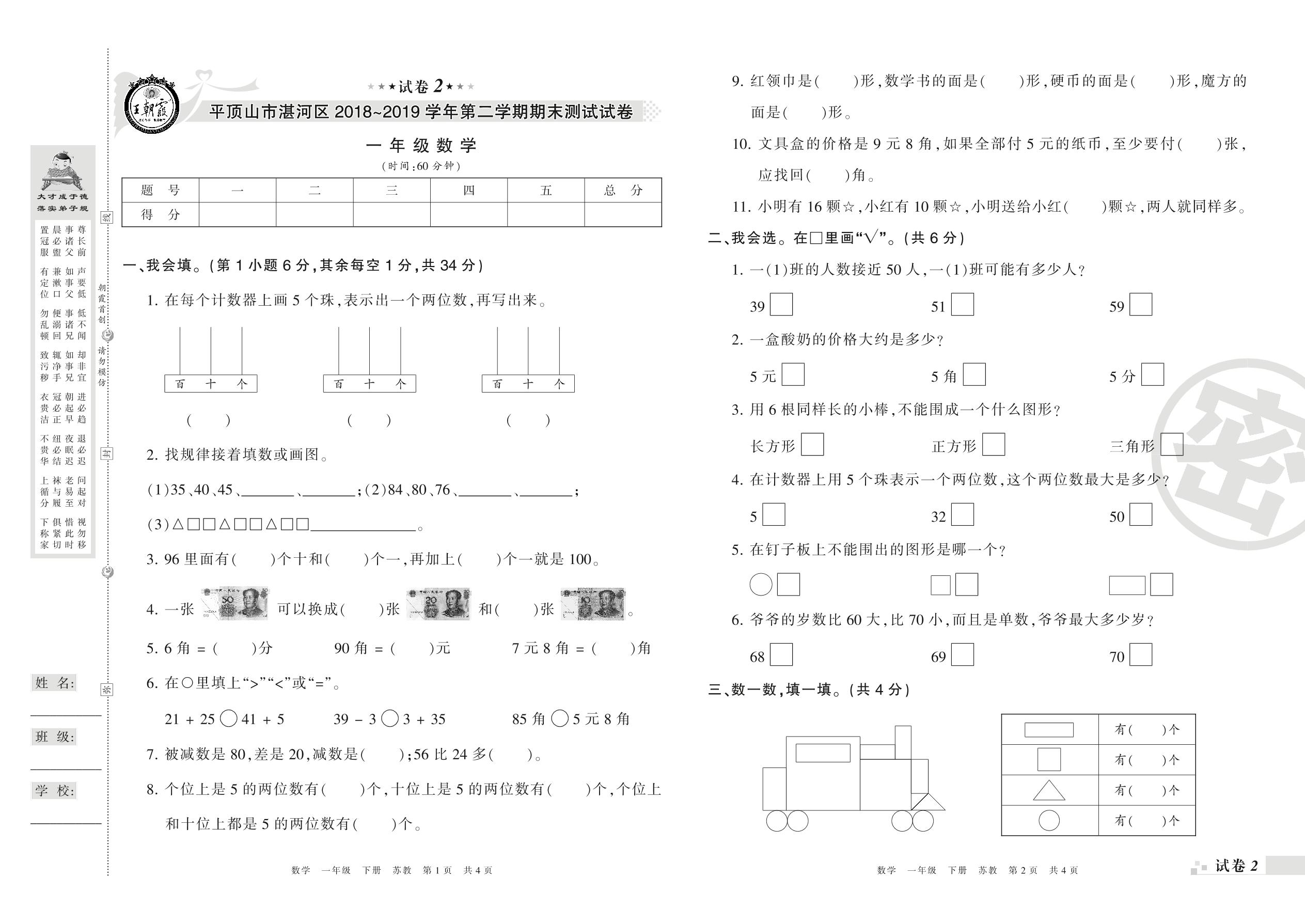 2018-2019学年第二学期平顶山市湛河区一年级数学试卷(苏教版)【2】