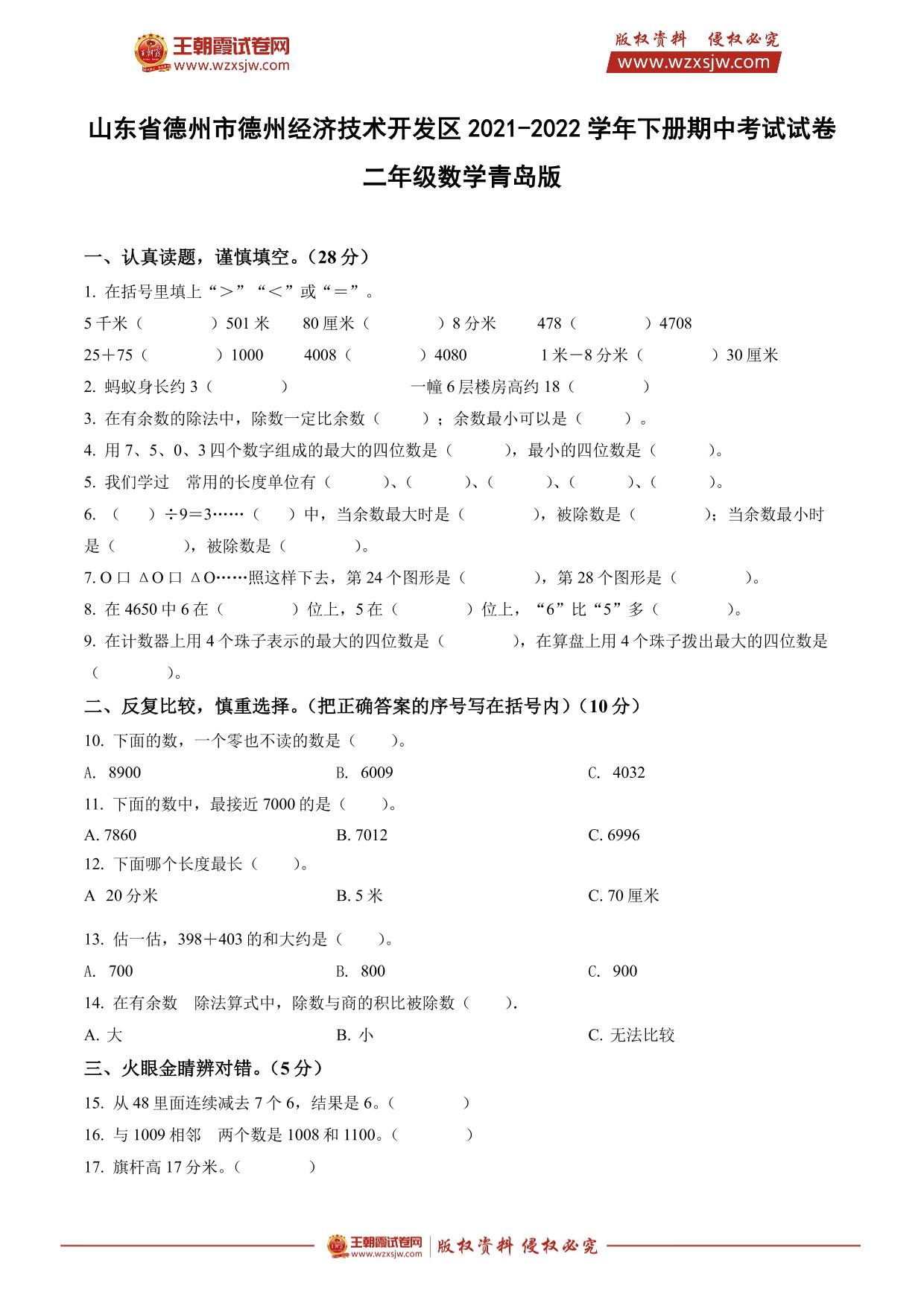 山东省德州市德州经济技术开发区2021-2022学年下册期中考试试卷二年级数学(青岛版)