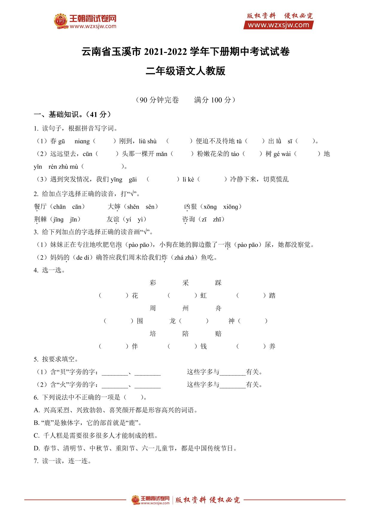 云南省玉溪市2021-2022学年下册期中考试试卷二年级语文(人教版)