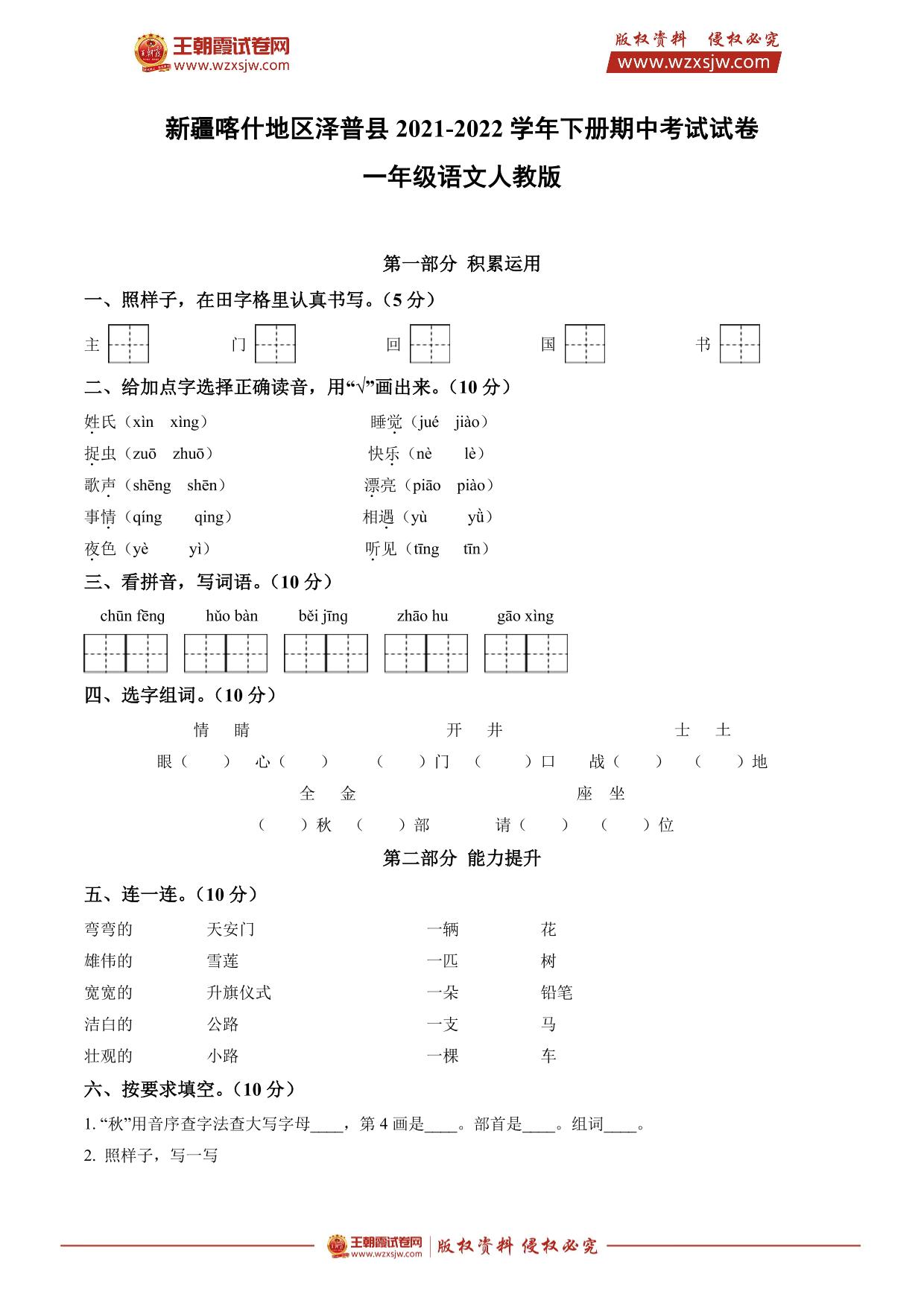 新疆喀什地区泽普县2021-2022学年下册期中考试试卷一年级语文(人教版)