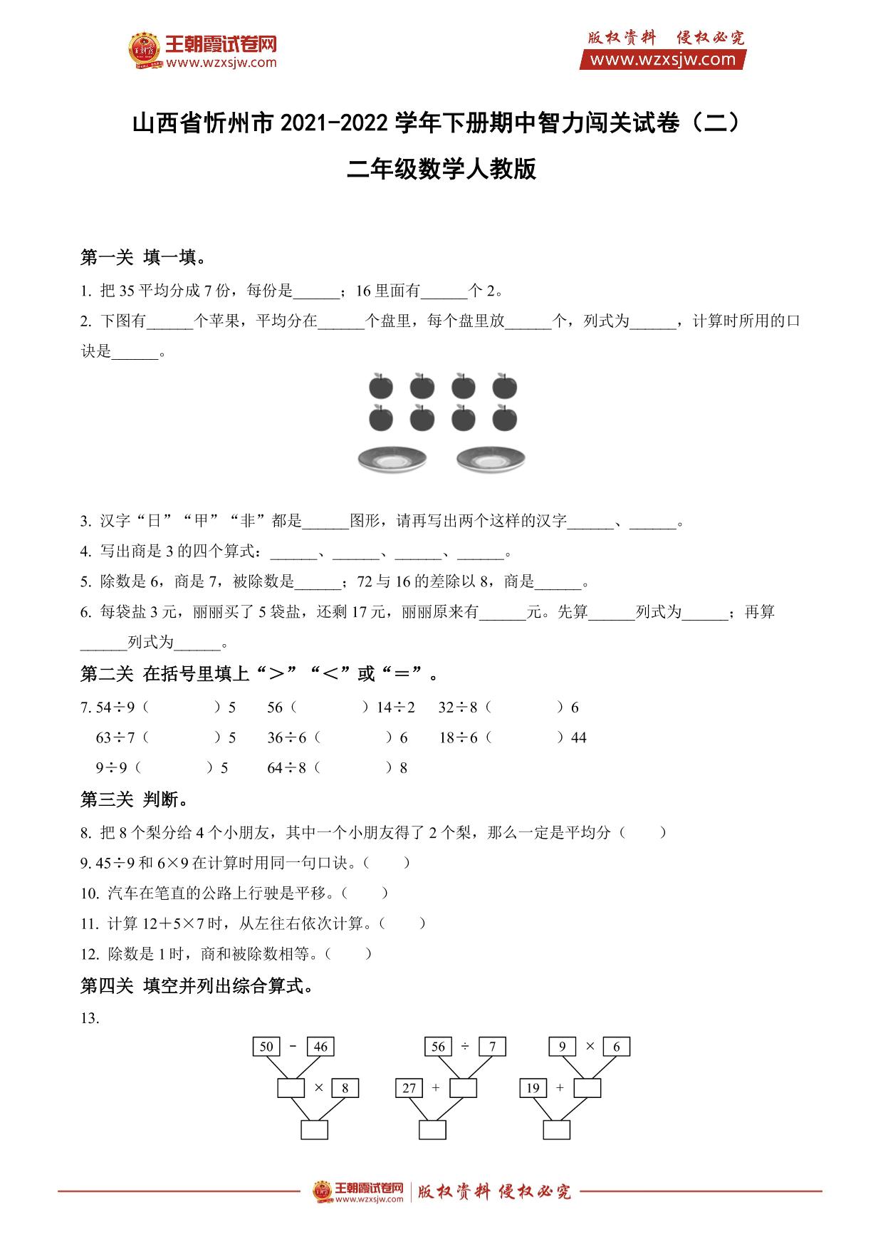 山西省忻州市2021-2022学年下册期中智力闯关试卷(二)二年级数学(人教版)