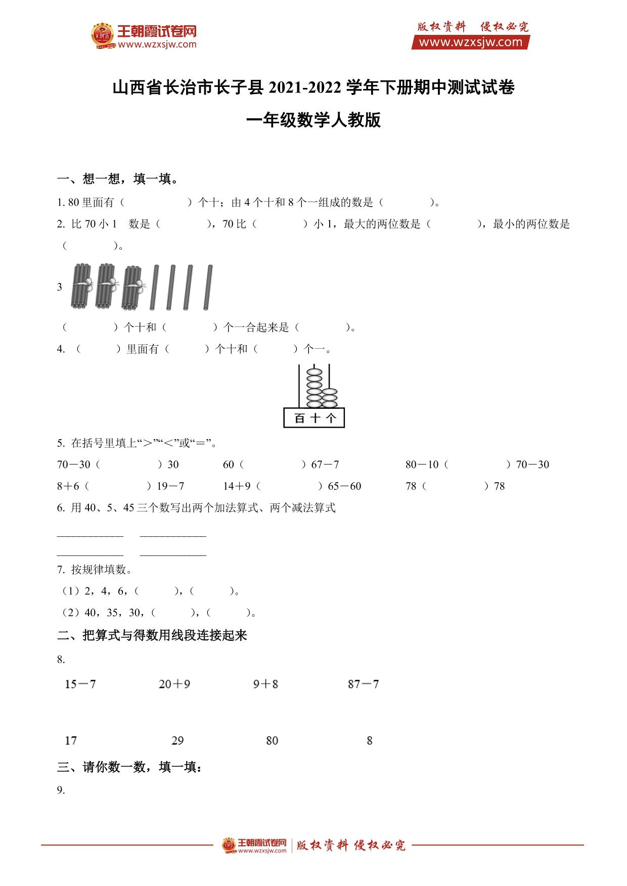 山西省长治市长子县2021-2022学年下册期中测试试卷一年级数学(人教版)