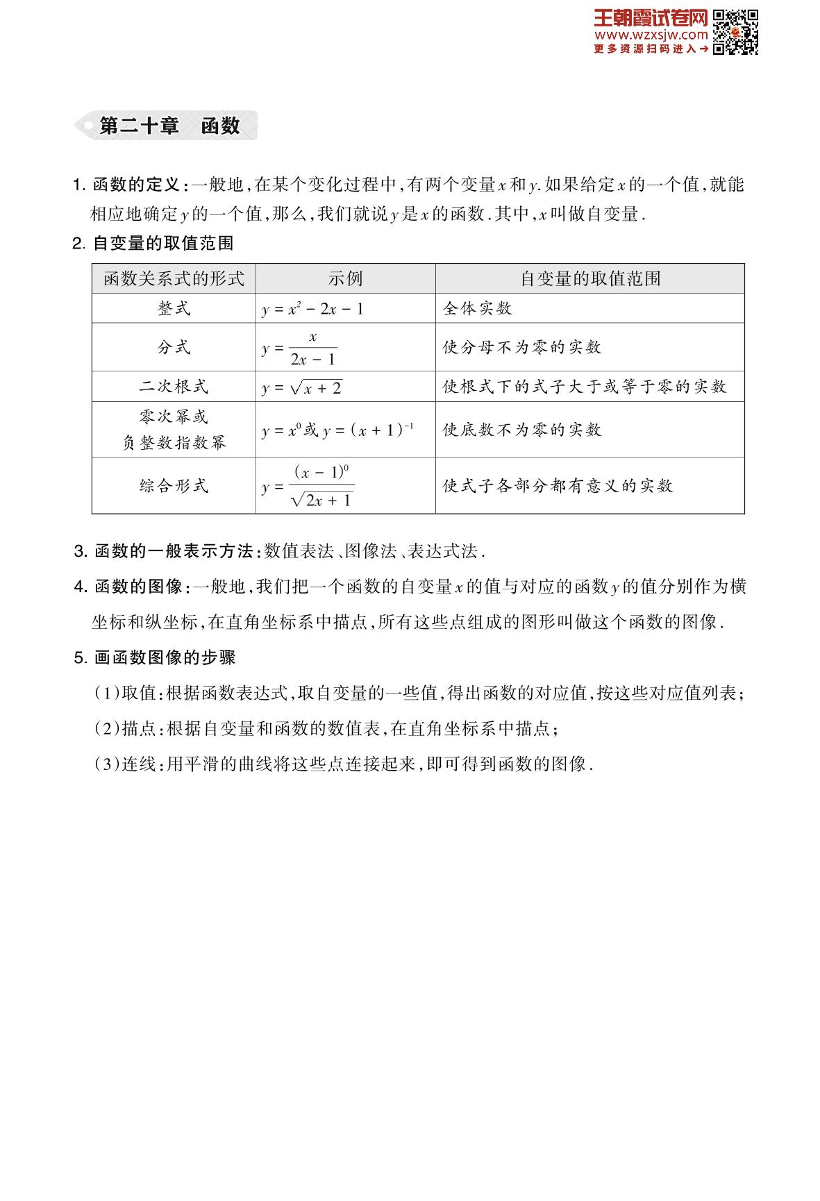 2023下册八年级数学冀教版 基础知识梳理——第二十章 函数