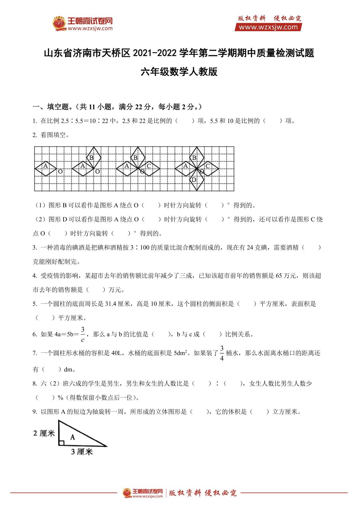 山东省济南市天桥区2021-2022学年第二学期期中质量检测试题六年级数学(人教版)