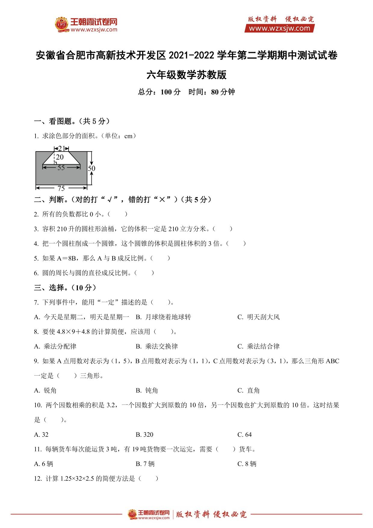 安徽省合肥市高新技术开发区2021-2022学年第二学期期中测试试卷六年级数学(苏教版)