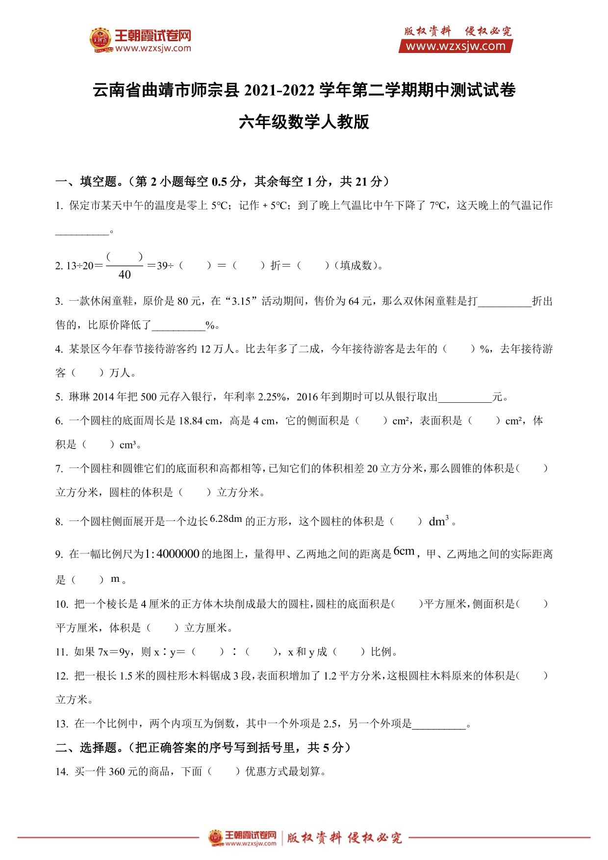 云南省曲靖市师宗县2021-2022学年第二学期期中测试试卷六年级数学(人教版)