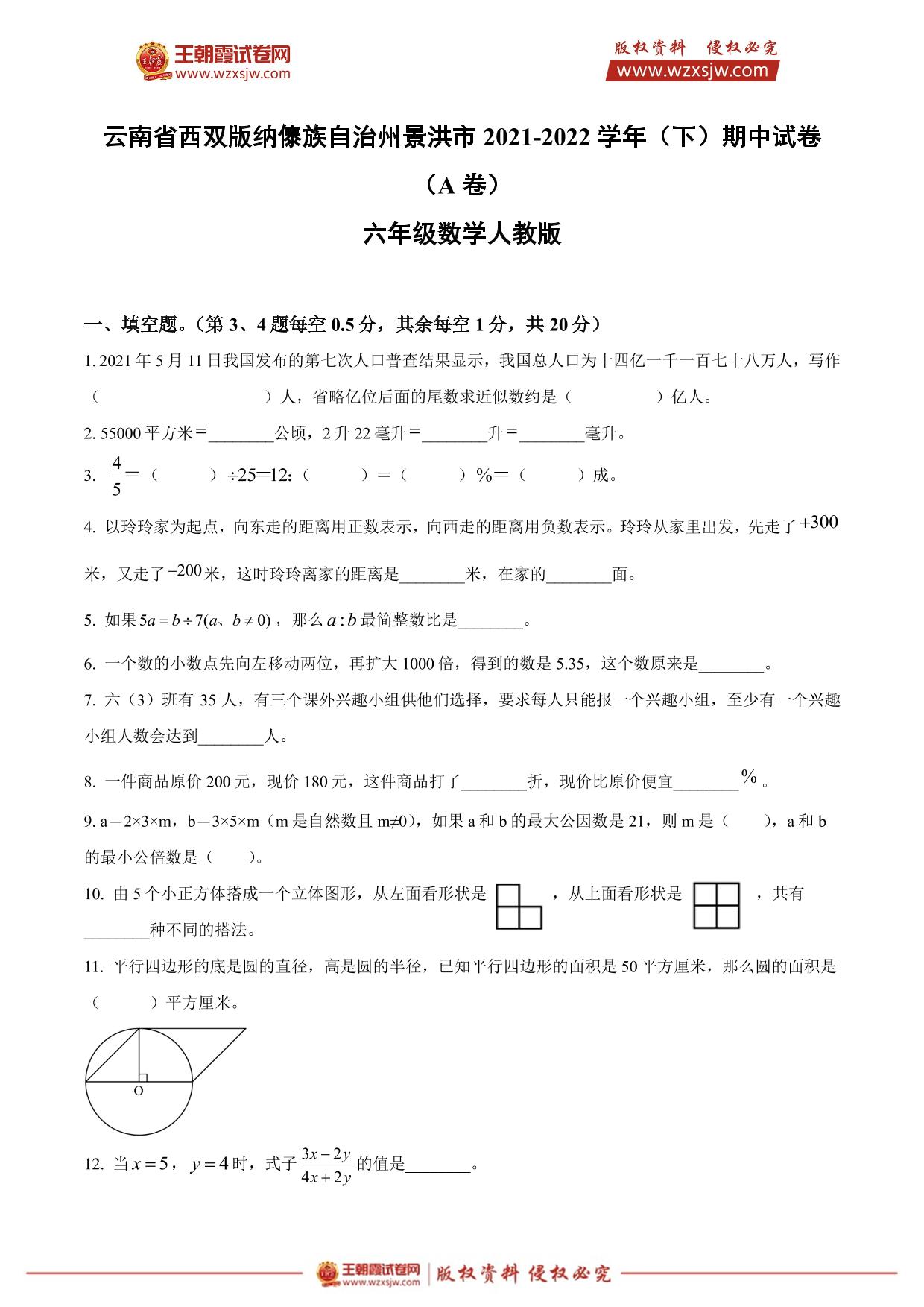 云南省西双版纳傣族自治州景洪市2021-2022学年(下)期中试卷(A卷)六年级数学(人教版)